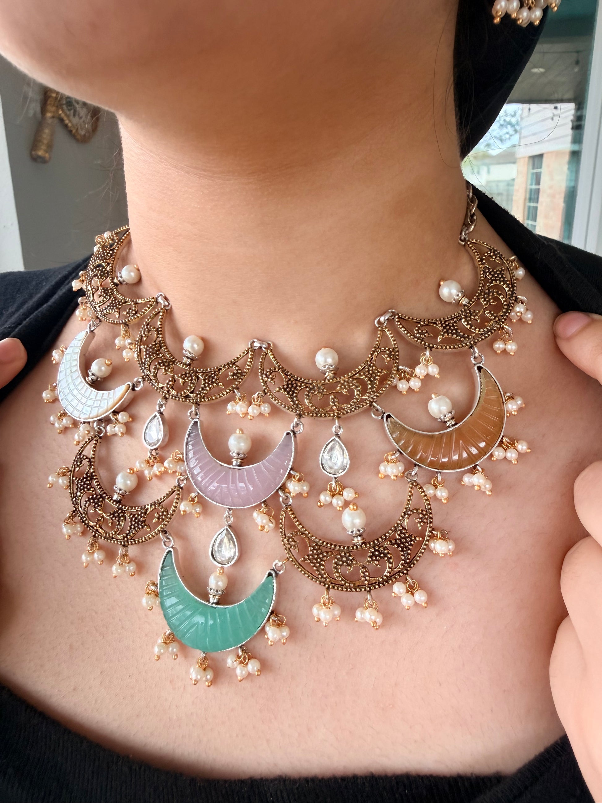 A lightweight Paachi kundan half-moon boho necklace set—perfect for vacations, outdoor shoots, and styling it your way.